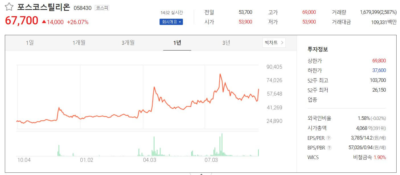 포스코스틸리온 - 코스피 058430 (포스코 관련주)