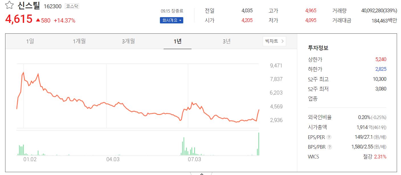 기존의 철강주들은 끊임없는 매도세로 인하여 바닥권에 가격을 형성하고 있는 경우가 많았습니다. 최근 중국의 철강 관련 부문의 감산으로 인하여 국내의 철강관련 사업을 영위하는 기업이 많은 수혜를 받을 것이라는 전망이 있었습니다.