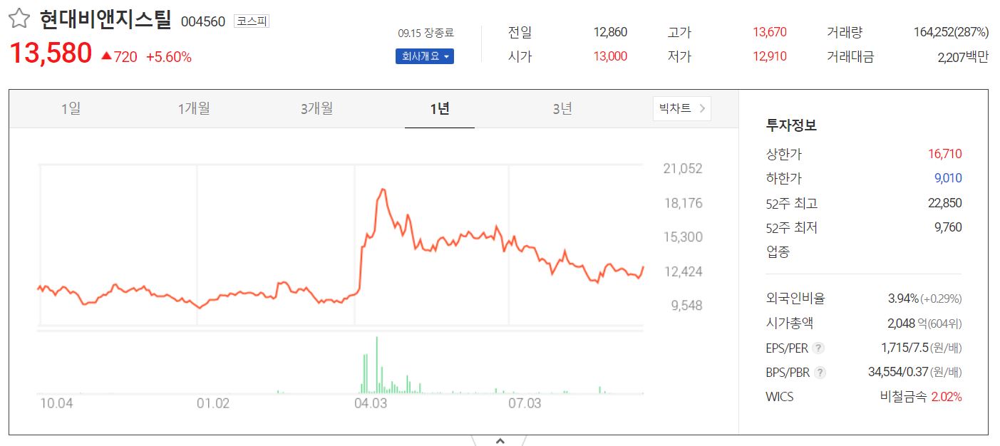 현대비앤지스틸 - 코스피 004560 (철강 관련주)
